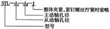例:STL3型,主動(dòng)軸孔6mm,從動(dòng)軸孔8mm,整體夾緊式 型號(hào)表示:STL3—6—8—J d1、d2可按客戶(hù)要求加工